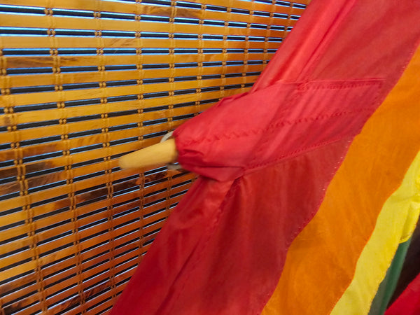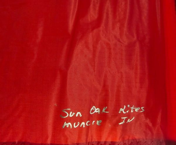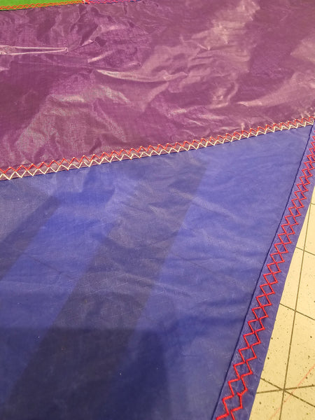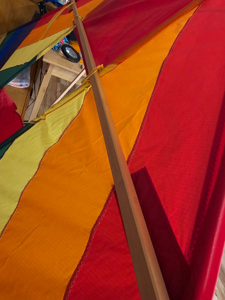 This kite is in STUNNING condition. You can see some corrosion on the o-rings, but the sail is crispy and shows no fading. Sewn with felled seams, this kite is GORGEOUS and deserves to be flown with love. There's a loose piece of sewn binding to be used to get the spreader into the second o-ring. The fit is very very tight.